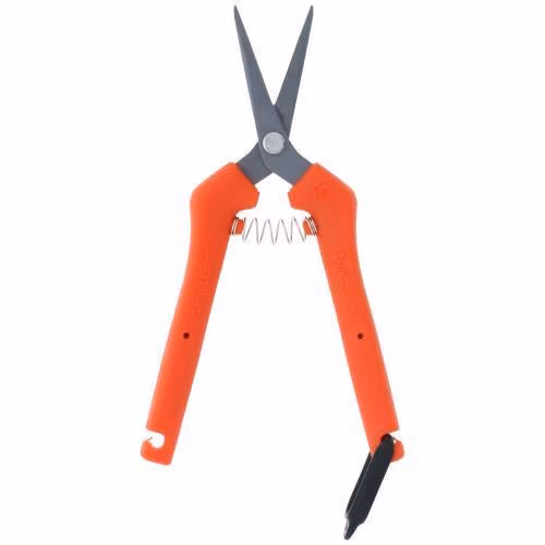The Chikamasa TP-500SF is a professional, lightweight, spring-loaded Japanese trimming scissor with straight, sap-resistant fluorine-coated stainless steel blades, designed for precision pruning, especially in cannabis cultivation, to reduce hand fatigue with its ergonomic resin grips, low-resistance spring, and rounded blade edges for plant safety, making it a top choice for detailed work like leaf trimming and bud shaping